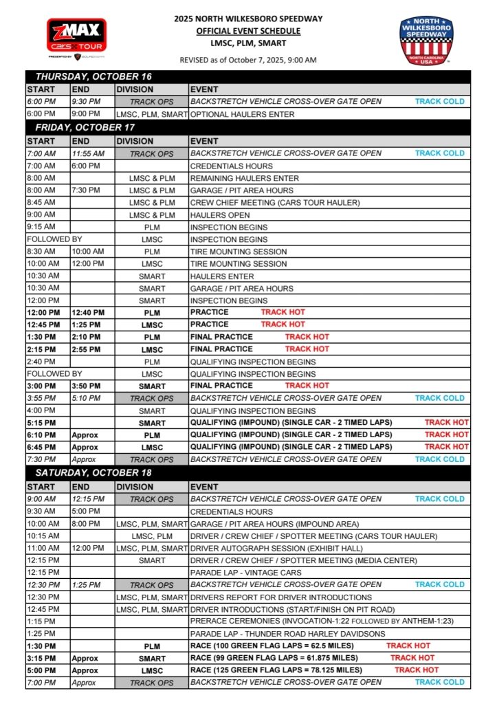 The Crossroads Harley-Davidson 125 for Late Model Stocks and the CARS PLM Tour’s Northwest Automotive 100 wrap up thrilling years for each division. Four drivers in the CARS LMSC Tour have multiple wins to their name in 2025, all while the PLM Tour has seen nine different competitors visit Cook Out Victory Lane.
