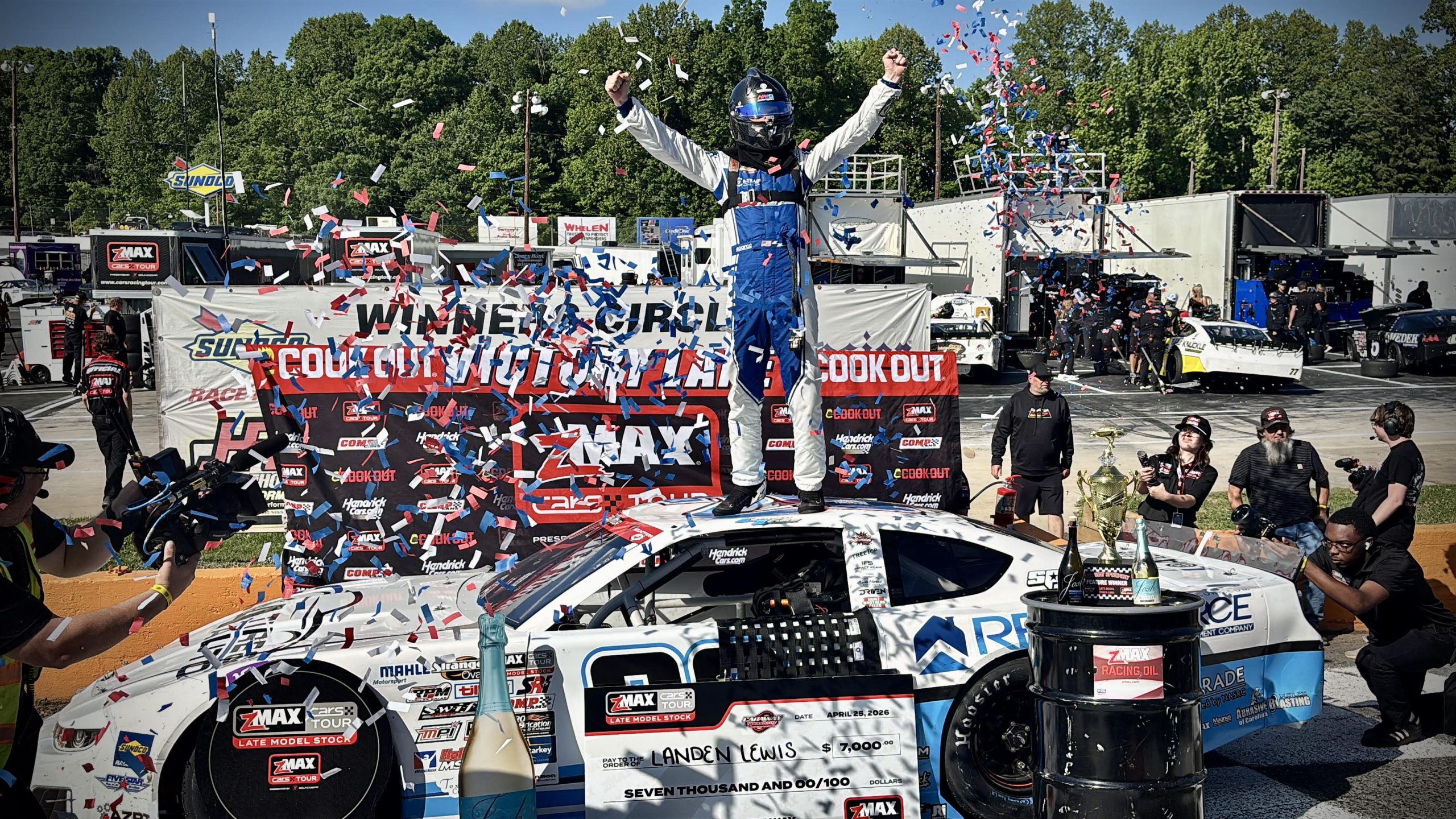 Lewis methodically worked his way through the field. He was up to third when Doug Barnes Jr. went up in smoke and flames with 35 laps to go. Conner Jones and Jared Fryar were on the front row for the restart. Jones and Lewis quickly moved past Fryar, the two then swapped the lead several times before Lewis muscled Jones out of the groove in Turn 3 and drove off to his first CARS Tour win of 2026.
