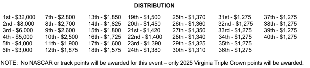 - $5,000 Doughton’s Racing Products Lap Leader Award paying $25 to the leader of each lap in the 200-Lap Feature.