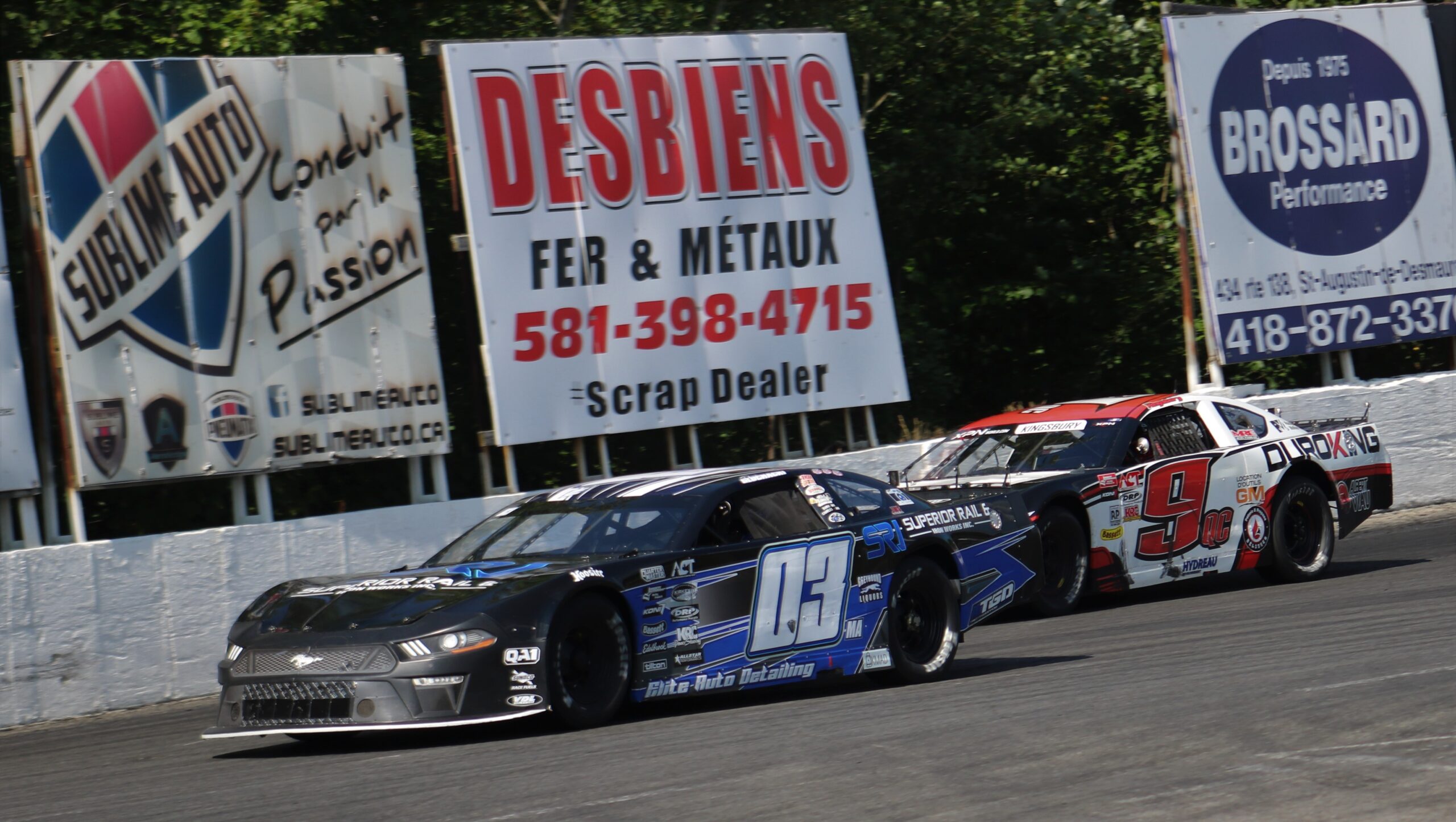 A similar crowd was on hand at Montmagny for only the third Tour event at the track just east of Quebec City, despite a one-day postponement due to rain. Gabe Brown nabbed the outside of the front row, but Quebec’s William Larue brought the field to green, dueling with Tour regular Jonathan Bouvrette in the opening laps.