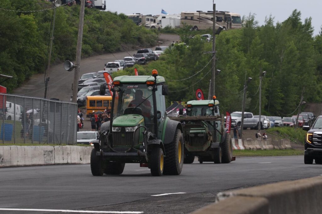 With more rain expected Sunday and many teams towing several hours to Quebec, ACT officials took an “at all costs” approach to getting the race in, trying to keep heat in the pavement as rain continued to fall. At last, the rain let up after 8:00pm. Plans were to roll out the day’s Sportsman feature to assist in drying the track further before the 149-lap ACT main event.
