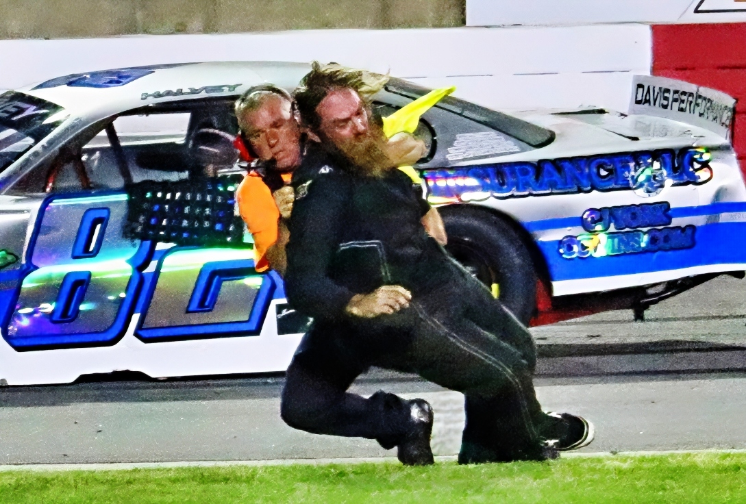 Brad was scored the winner in a photo finish. After the checkered flag, Emilee Lewis, who finished third and is the daughter of Brad, wrecked Zack Staley into Turn 1. After the cars parked on the frontstretch, Zack got out of his car, still sitting in Turns 1 and 2, and sprinted across the infield.