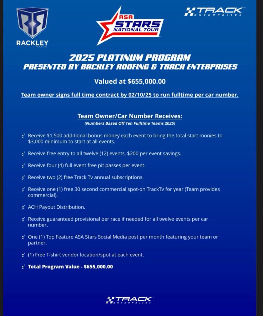 The ‘Platinum Program presented by Rackley Roofing,’ inspired by the World of Outlaws program of the same name is replacing the winner’s circle program used over the past two years. Valued at $655,000, a 925 percent increase, the goal is to entice a wider array of race teams to run the full season.