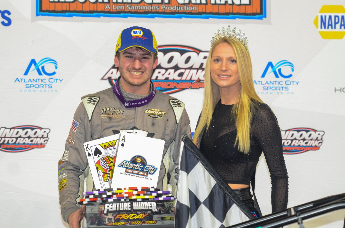 Briggs Danner inherited the lead when Andy Jankowiak and Tommy Catalano got together in turns three and four seven laps from the finish before holding off fellow USAC Sprint Car star Justin Grant and multi-time Gambler’s Classic champion Anthony Sesely to win Friday night’s thrilling BlackJack 21 NAPA Auto Parts Atlantic City Indoor Races at Jim Whelan Boardwalk Hall.